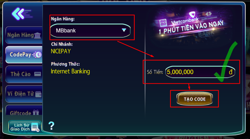 Bước 3: Chọn “codepay” là phương thức nạp tiền